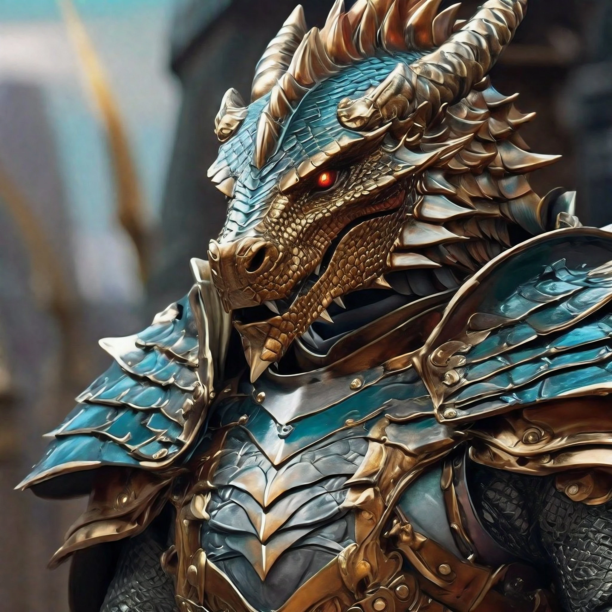 a dragon gazing at the camera, his armor is intricately detailed, detailed clothing, greatsword on back, UHD, oil painting, raytracing, godrays, detailed face, ironpunk style
