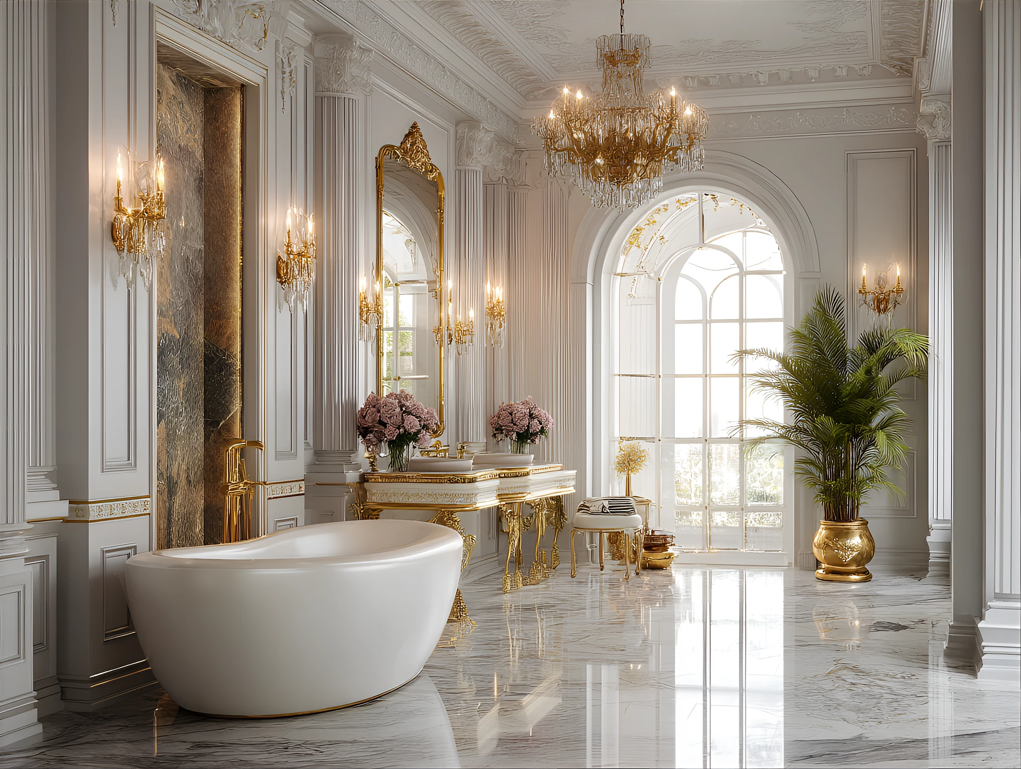A luxurious and elegant bathroom in a Neoclassical-style mansion, with marble floors, a freestanding bathtub, and golden fixtures, photographed with natural light to emphasize the grandeur and opulence of the space