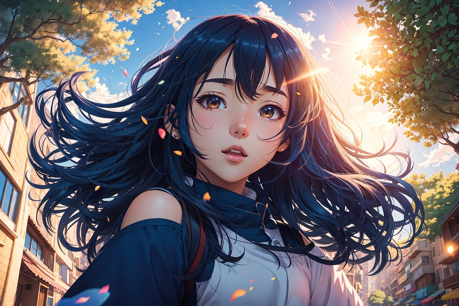 (masterpiece) , (anime style) , centered, shot from below, Instagram able, 1girl, selfie pose, long wavy hair, dark blue hair, expressive, city park background, fisheye effect, sunlight, backlight, dynamic lighting, reflection, depth of field, ultra detailed, intricate, (epic composition, epic proportion) , 2D illustration, professional work, inspired by makoto shinkai,