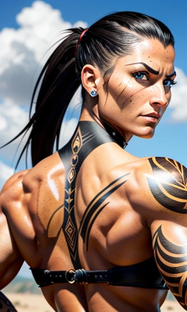 A portrait of a muscular and futuristic female tattooed gladiator, long black ponytail hair cascading down her back, detailed, vivid, bronze rustic filter effect, a toned and well-defined physique, intense brown eyes, epic battle scars, tan skin, divine complexion, and dark hair emanate a powerful aura, cinematic focus, emphasizing the gladiator's figure and creating a captivating atmosphere, high-definition, high-resolution, utilizing the Unreal Engine 5, in 8K resolution, resulting in incredibly detailed visuals
