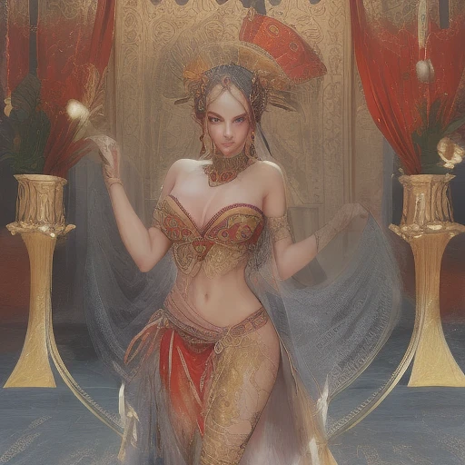 *Description* A breathtakingly detailed, hyper-realistic depiction of a gorgeous woman in a stunning red belly dancing outfit, adorned with intricate gold jewelry and a majestic forehead piece, and accentuate her beauty, her stomach is taut and chiseled, standing seductively in a serene desert temple with ornate pillars. *Character Details* - Exquisite, photorealistic face with precise cosmetic features -Stunning, detailed eyes sparkling with vitality - Full, luscious lips - Flawless, radiant skin - lithe, taut chiseled stomach, DD breasts, accentuated by the fitted top and bottom. - waist length luscious, dark hair cascades beautifully around her. - wears a matching red skirt and bra, exuding an air of exotic elegance, both are adorned with gold accents, golden embroidery and green gemstones. - The skirt is split at the front, revealing her leg, is adorned with gold accents, gold embroidery, and green gemstones. *Attire and Accessories* - Gold jewelry, gold chains, wrist cuffs, upper arm coifs, belly button adornment, thigh bands, ankle cuffs, headpiece and a gold band encircling the neck add a touch of luxury, elegance, beauty and mystery. - Intricate embroidery and patterns decorate the outfit along with green gemstones *Environment* - golden sunlight lighting creates an enchanting ambiance. - Fantasy desert temple background with ornate pillars, ethereal, swirling clouds - Dramatic, cinematic lighting with soft, golden hues - Wide-angle perspective, emphasizing grandeur *Overall Mood* - The woman's pose and attire evoke a sense of mystery and allure. - Her confident stance suggests she is about to perform a mesmerizing dance. *Rendering Details* - 8K resolution with sharp focus - Hyper-realistic rendering with extreme details - Photorealistic textures and shading - Cinematic, high-contrast lighting