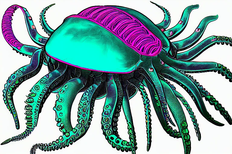 a higly detailed scientific drawing of a cambrian era horseshoe crab octopus hybrid with each part labeled in japanese by charles darwin and andy warhol, dayglo pink, dayglo blue, glowing, prismatic, trending on artstation