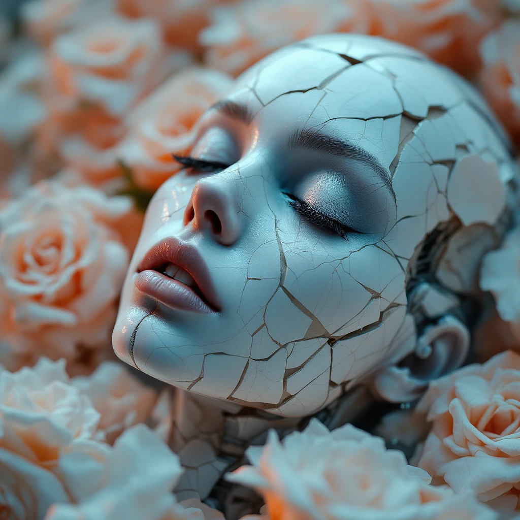 Death of a beautiful humanoid female, close up of a broken android, digital art, cracked porcelain face, futuristic look, captivating, close-up, skull, fragile, emotional, shatter into fragments, shattered glass, shattered pieces of a woman body, made of porcelain, broken, destroyed, abstract patterns, tile art, white roses, portrait photography, cinematic, matte orange and light shiny blue, shallow depth of field --ar 4:5 --s 750 --v 6