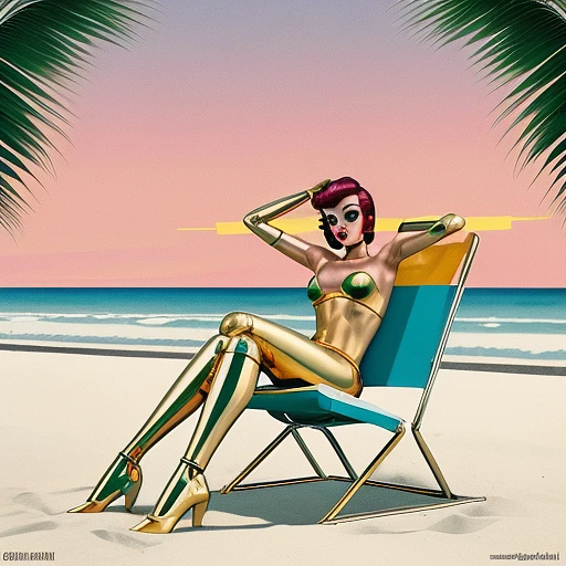 80s chrome and steel Retro Sunset, golgen hot robot girl in bikini, sitting on beach chair, legs up in the air like a 50s pinup girl, 80s esthetics, water, gold, illustration, inspired by James Jean 80s chtome and steel Retro Sunset, beach and palms scene, green, gold, illustration,