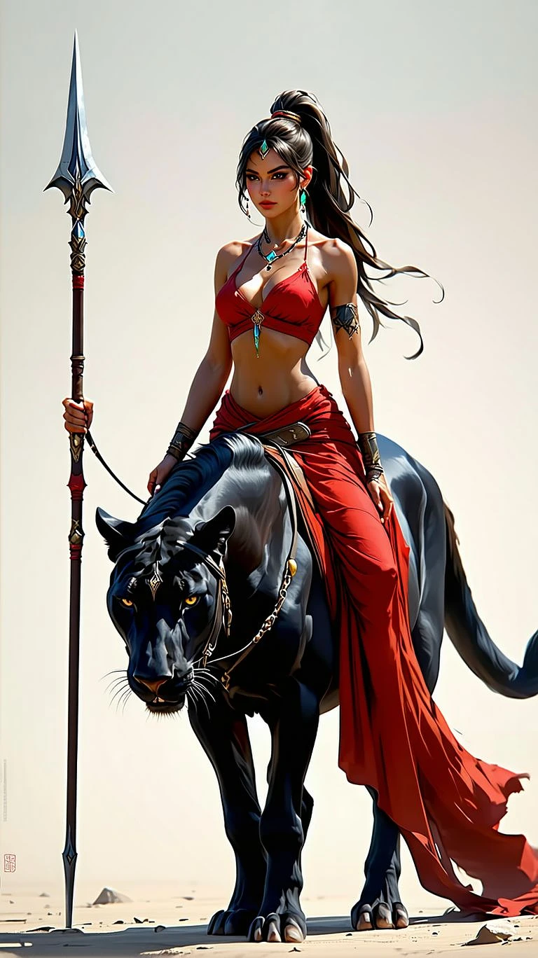 create princess lylian by wlop, a beautiful woman, athletic figure full body view. Her hair is long and pulled back into a high ponytail, dark brown in color. Barefoot in minimal clothing, wearing a red crop top and a flowing long red skirt that billows slightly in the wind. belly piercing, many intricate jewels. Rides a horse-sized black panther. She holds a long spear at the head of an army of knights.