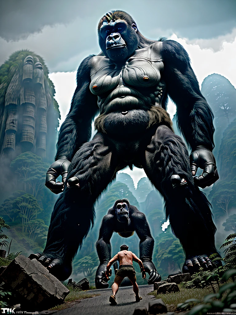 Photo of a ultra realistic King Kong movie scene, bright light, cinematic lighting, battered, low angle, trending on artstation, 8k ultra HD, hyper realistic, focused, extreme details, unreal engine 5, cinematic, masterpiece, art by studio ghibli, intricate artwork by john william turner