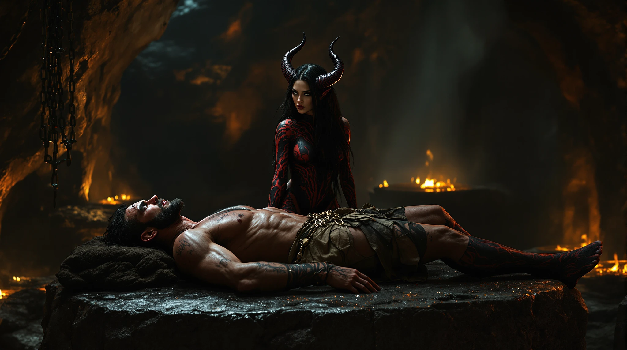Two figures on a stone altar in a dark cave: an exhausted muscular male warrior lying on his back, covered in sweat and battle scars, wearing tattered loincloth, next to him stands a seductive demonic woman (strong physics and black bodypaint) with curved horns and red snakeskin pattern bodysuit. Her long black hair flows down as she watches him. Tourches lighten up her face. She looks straight in the camera lens. Dark dungeon setting with lava pools casting warm light, chains hanging from ceiling. Atmospheric lighting with golden glow, cinematic composition, 8K, ultra detailed.