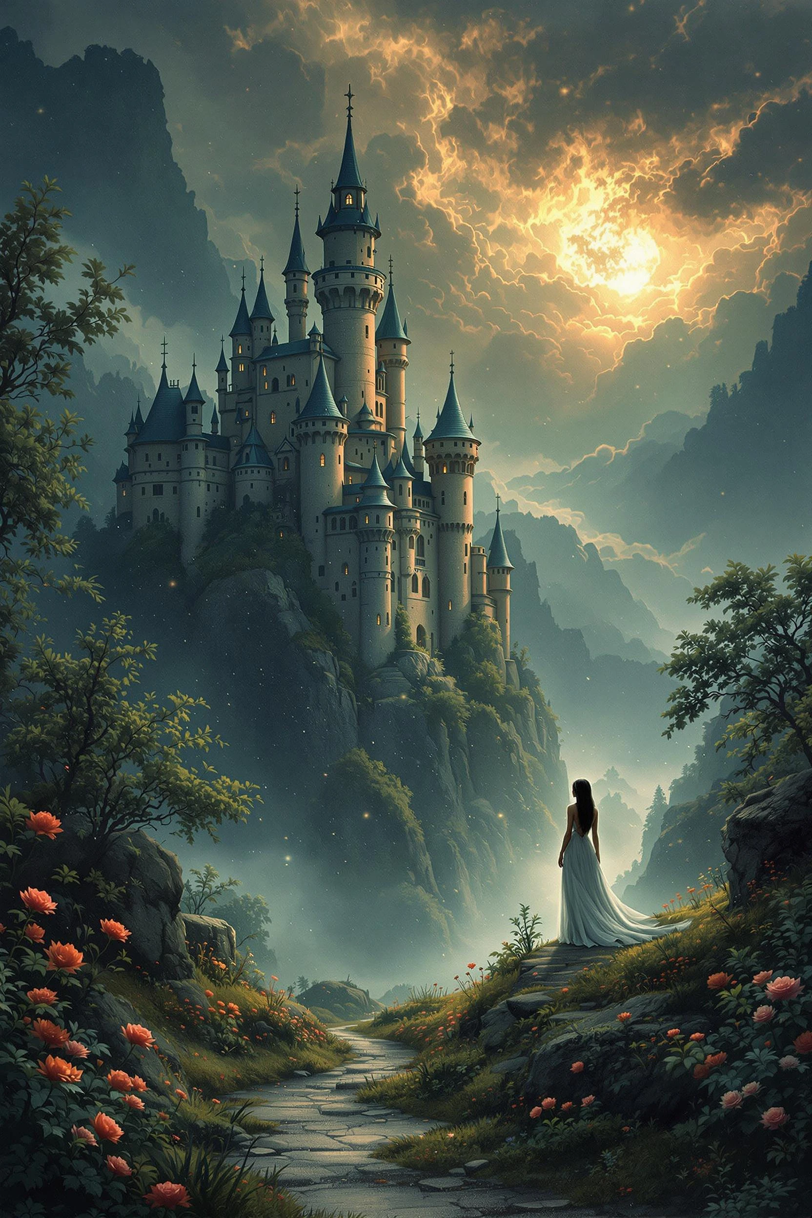 monde fantastique, les rêves deviennent réalité, image surréaliste d'une belle imagination fantastique, très détaillée, 8 k, très détaillée, brumeuse colorée mais sombre , secrets de la vie, lumières dynamiques, jesper eijsing, une princesse fantastique regarde dans un paysage, château, très beau