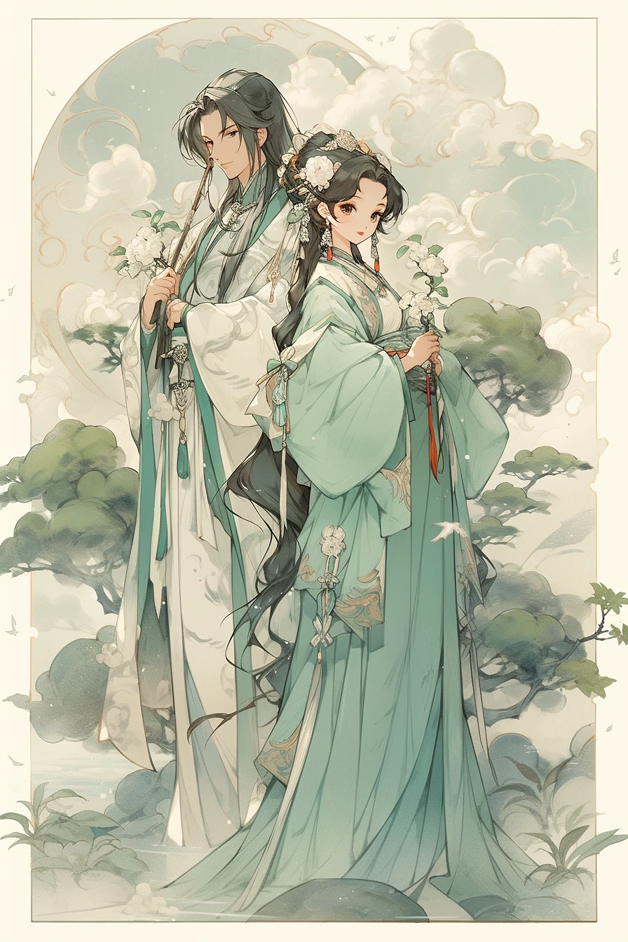 A man and a woman standing together, surrounded by swirling clouds of mist and lush vegetation. They are both dressed in intricately detailed Tang Dynasty attire of light green and white. The man's outfit is adorned with elegant embroidery, depicting traditional motifs and symbols of prosperity. The woman's dress showcases delicate floral patterns, as if inspired by the beauty of nature itself --ar 2:3 --niji 5 --s 1000