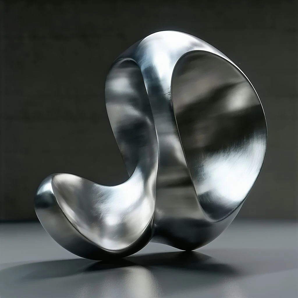 Convert the uploaded object into a hyper-realistic 3D render of a metallic sculpture. The sculpture should be made of polished and brushed steel, with clean reflective surfaces and subtle material imperfections like soft bevels, fine edge wear, and smooth transitions. Maintain all original proportions and structural details of the uploaded shape. Use cinematic HDRI-style lighting to highlight contours, reflections, and surface depth. Render the object isolated on a transparent PNG background, with no shadows, floor, or environment. The final output should resemble a professional concept model — suitable for use in product design, branding, or digital mockups