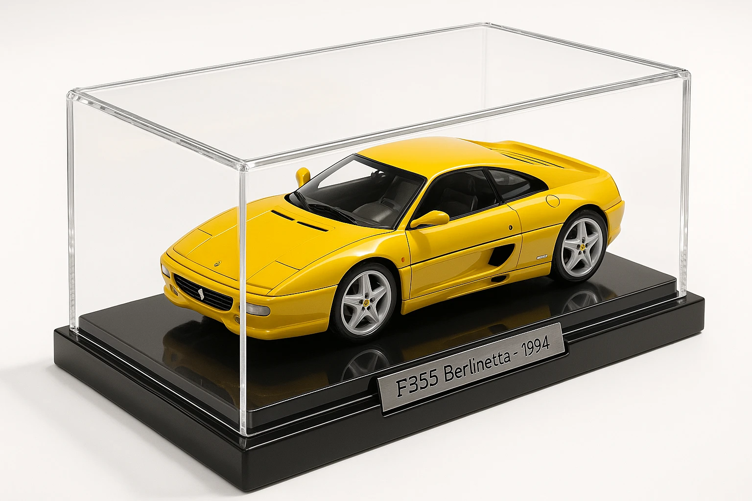 Hyper-realistic isometric view of a scale model of a yellow Ferrari F355 Berlinetta (1994) , placed inside a crystal-clear acrylic display case with sharp reflections and subtle light refractions. The car features precise aerodynamic lines, detailed silver alloy wheels, authentic vent grilles, realistic headlights, and the iconic Ferrari logo on the hood. The black base includes a glossy metal plaque engraved with "F355 Berlinetta - 1994" and a small Ferrari shield emblem. Studio-quality white background with soft shadows, capturing every fine detail as in a collector’s product photo.