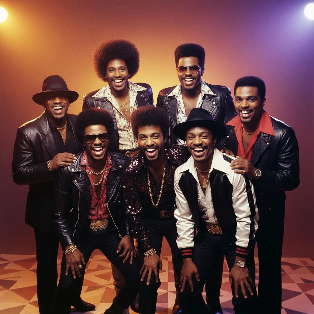 1980s funk and soul band, six stylish African-American men posing together for a promotional photo, joyful expressions, big smiles, funky hairstyles, leather jackets, retro accessories, vibrant studio lighting, warm tones, authentic 80s aesthetic, no text or logos --ar 1:1 --v 6 --style retro