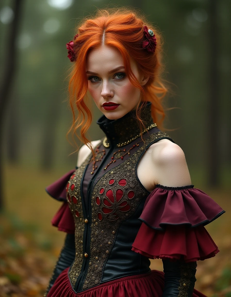A beautiful redhead female country artist wearing a steampunk-inspired layered gown. She has clean makeup and is captured in vivid colors, embodying the essence of fantasy and a minimalist, fantastical, edgy, and regal themed outfit, with depth of field