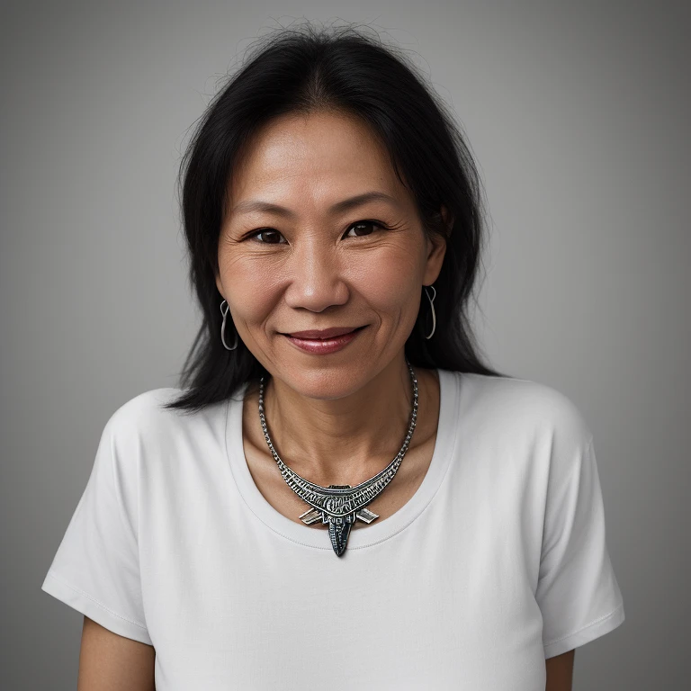 hyper realistic headshot photo of a 45 year old inuit woman, t-shirt, extreme slim, extreme skinny, expensive jewelry, looking into the camera, smiling slightly, ultrarealistic, soft lighting, 8k