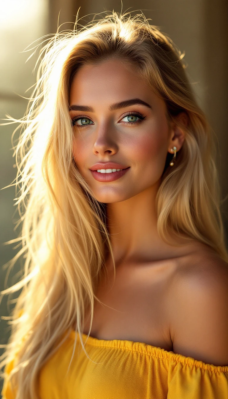 "Image is a portrait-style photograph featuring a woman with long, flowing blonde hair that catches the warm sunlight, creating a halo effect. She has fair skin and striking green eyes, accentuated by subtle makeup. Her facial features include high cheekbones and a bright, genuine smile. She is wearing an off-the-shoulder yellow coloured top, which complements the warm tones of the image. The background is softly blurred, focusing attention on her face and the play of light in her hair. The overall composition is balanced, with the subject centered and the lighting enhancing her features. "