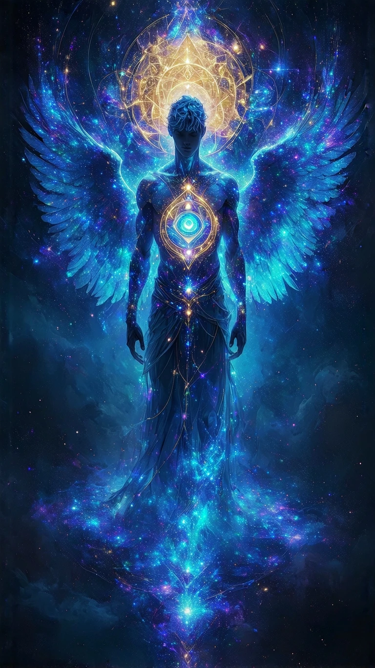 A luminous, divine figure floats at the center of an infinite cosmic mandala, their form seamlessly blending into the fabric of the universe. Their body shimmers with opalescent light, wrapped in flowing golden silks adorned with celestial sigils and sacred fractals. They radiate an aura of fulfillment, unity, and transcendence. Encircling them, four celestial guardians take shape—each an ethereal embodiment of the elements, glowing with infinite wisdom. A cosmic lion, its mane swirling with liquid galaxies; a winged neon eagle, its feathers woven from pure stardust; a radiant celestial bull, formed from molten silver; and a spectral human figure, shifting between past, present, and future. Around them, the cosmic wheel of existence turns, inscribed with shifting holographic runes, symbolizing the completion of the great journey. The fabric of space ripples, revealing parallel dimensions, melting landscapes, and infinite spirals of creation and destruction. Above, a radiant opal eye watches from the center of the mandala, pulsing with universal awareness. The background dissolves into an endless dreamscape—nebulae bursting like surreal flowers, mirrored dimensions unfolding, and golden threads weaving the universe into an eternal symphony. Salvador Dalí surrealism, hyper-detailed, infinite cosmic unity, radiant completion, glowing celestial energy, surreal cosmic mandala, neon dreamscape, cinematic 4K masterpiece, volumetric light, divine perfection. --avoid: malformed anatomy, extra limbs, distorted proportions, blurry, low-resolution, pixelated, unrealistic reflections, stretched features, floating artifacts, oversaturated hues, cartoonish, low-poly, noisy, artificial lighting, watermark, text artifacts.