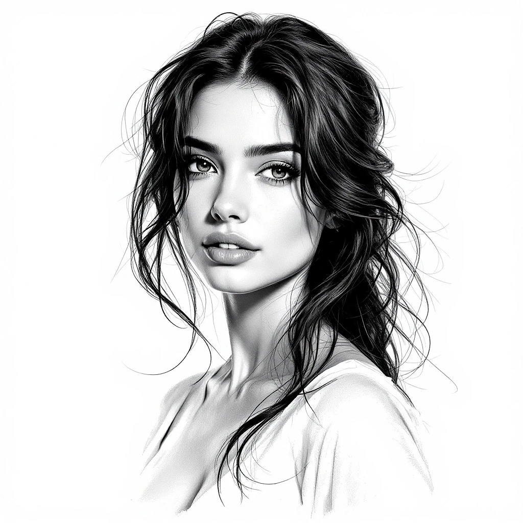 Realistic black and white sketch of a beautiful Spanish woman, white background --chaos 75 --ar 1:2 --style raw --profile rsy6uq9 --stylize 750