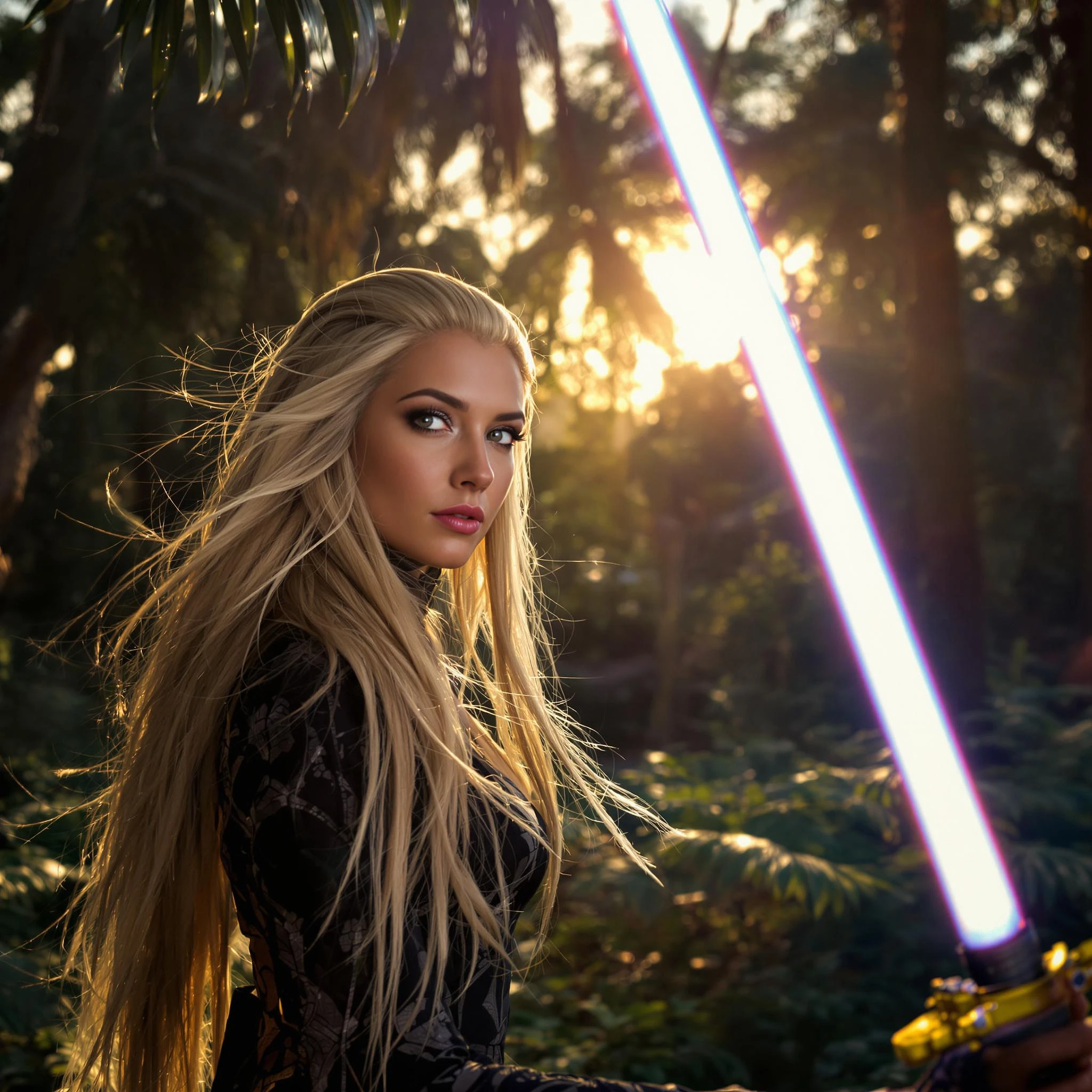 beautiful angle view of Species woman individual from another planet with blonde long hair, beautiful grey eyes, standing in tropical forest, use laser saber, breeze at dawn, cinematic, 32k, stills from Steven Spielberg epic film, clear focus, hyper realistic