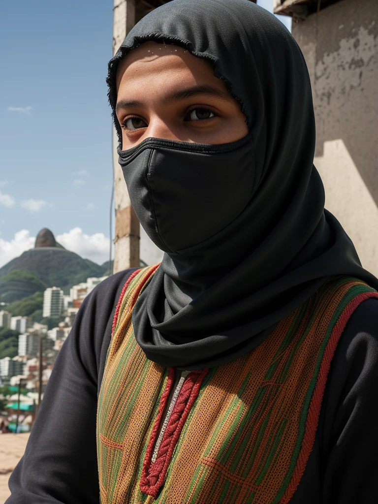 portrait of young muslim dressing balaclava in Rio de Janeiro favela, ultra realistic, 8k full HD, low angle, unreal engine 5, cinematic, masterpiece, insane detail, real photography, bright colors, sun-soaked colours, Fujifilm X-T4, Sony FE 85mm --ar 900:1600 --s 750 --style raw --v 5. 2