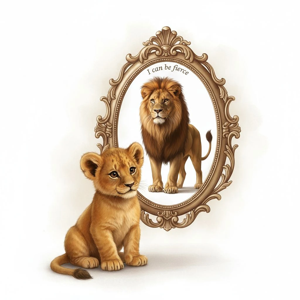 A small, adorable lion cub with soft golden fur sits in front of an elegant oval mirror. The cub gazes into the mirror with wide, curious eyes, and in the reflection, a powerful, regal adult lion with a full mane stands tall, exuding confidence and strength. The ornate mirror frame is delicately inscribed with the words: "I can be fierce. " The scene is set against a clean, pure white background, with gentle airbrushed shading that gives the image a dreamy, inspirational feel. The overall composition is uplifting and motivational, rendered at 400 pixels.