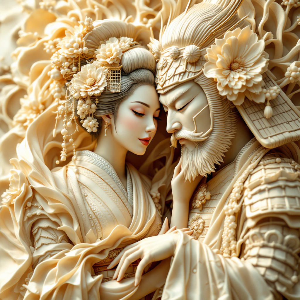 A stunning ivory sculpture depicting a geisha and a samurai in dynamic poses, a harmonious blend of softness and strength. The exquisite details, from the folds of the geisha’s kimono to the details of the samurai’s armor, are carved with fantastic precision, creating a smooth and alluring texture. Their facial expressions, captured in a moment of meaning, tell a rich and emotional story. The light falling on the ivory surface creates a dazzling shimmering effect, highlighting the beauty and elegance of this work of art. Overall, it is a perfect blend of superb artistic skill and alluring theme, a truly stunning and unforgettable masterpiece.