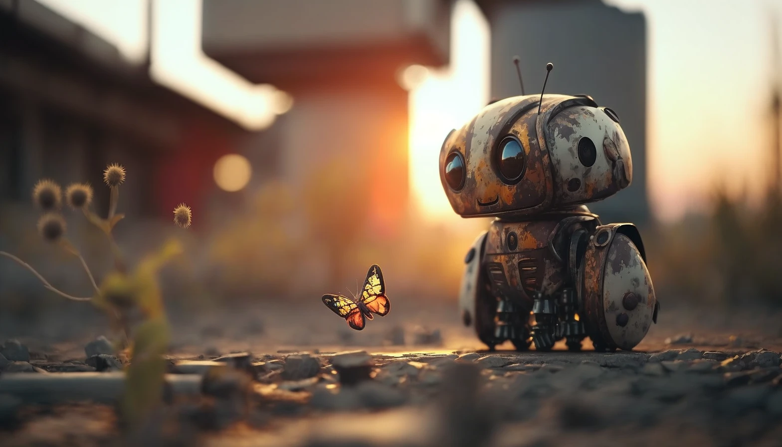 an old rusty robot in an abandoned city and a small adorable butterfly. against the backdrop of sunset. Bokeh, Blurry, Colorful, 4k, Cinematic Lighting, RTX, --ar 16:9