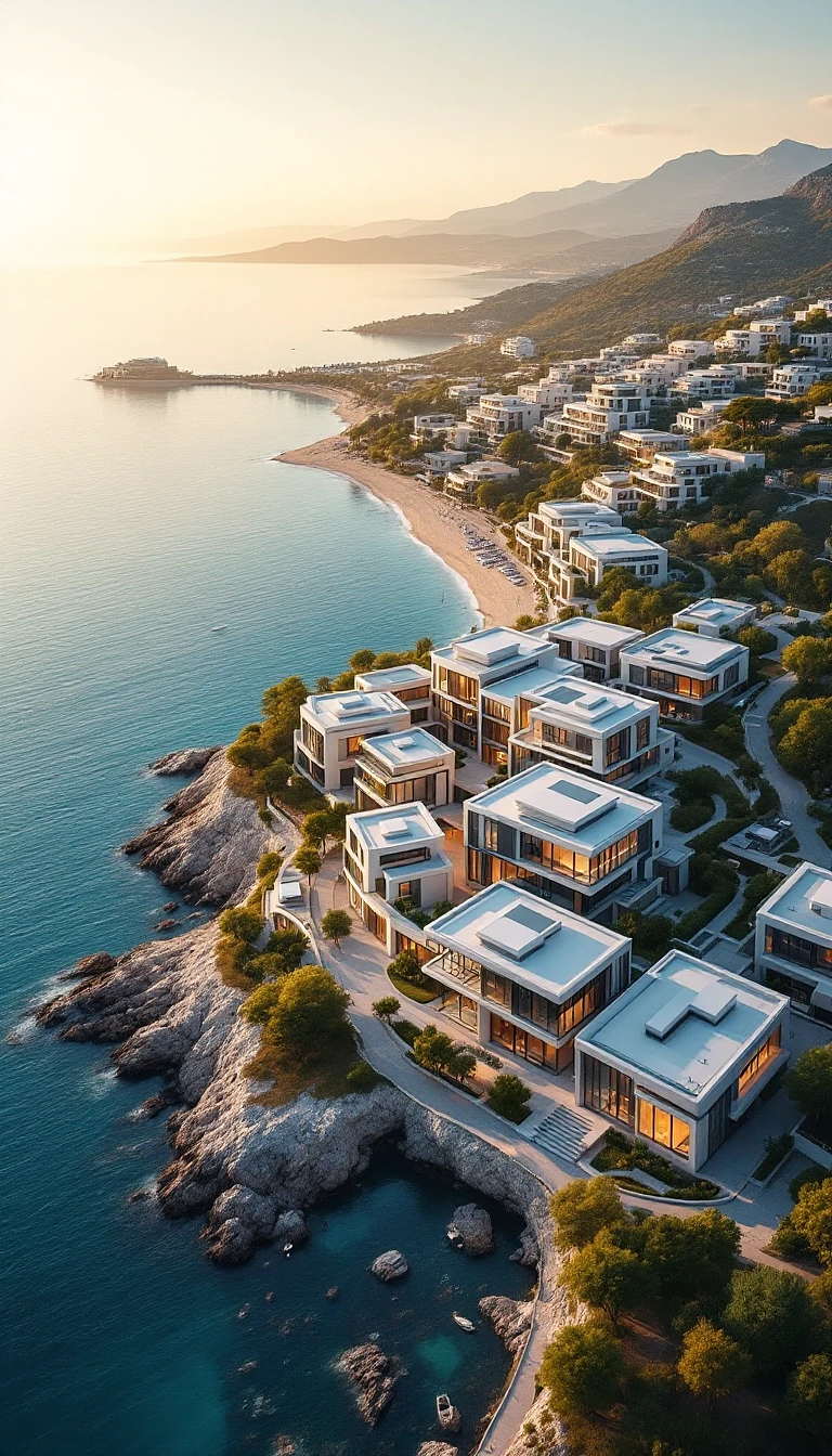 Ultra-realistic aerial cinematic view of Crimean coastline, focusing on modern luxury hotel complex. Minimalist architectural design with clean, geometric lines and flat white/gray roofs. Sleek contemporary buildings with glass facades, seamlessly integrated into coastal landscape. Pristine waterfront with architectural precision, minimal landscape intervention. Scandinavian and Japanese minimalist design influence. Sharp architectural lines, maximum transparency, neutral color palette - whites, grays, soft concrete tones. Modern infrastructure, subtle architectural bridges connecting buildings. Golden hour lighting with soft shadows, creating depth and sophistication. Hyper-detailed urban planning, 8K resolution, photorealistic architectural photography style. Emphasis on clean design, negative space, and architectural elegance. No traditional mountains, focus on smooth coastal terrain and cutting-edge architectural solutions.
