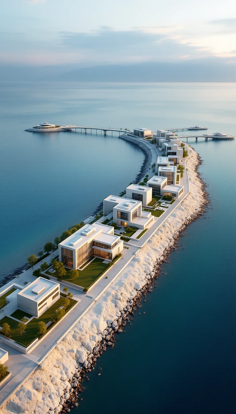 Ultra-realistic aerial cinematic view of Crimean coastline, focusing on modern luxury hotel complex. Minimalist architectural design with clean, geometric lines and flat white/gray roofs. Sleek contemporary buildings with glass facades, seamlessly integrated into coastal landscape. Pristine waterfront with architectural precision, minimal landscape intervention. Scandinavian and Japanese minimalist design influence. Sharp architectural lines, maximum transparency, neutral color palette - whites, grays, soft concrete tones. Modern infrastructure, subtle architectural bridges connecting buildings. Golden hour lighting with soft shadows, creating depth and sophistication. Hyper-detailed urban planning, 8K resolution, photorealistic architectural photography style. Emphasis on clean design, negative space, and architectural elegance. No traditional mountains, focus on smooth coastal terrain and cutting-edge architectural solutions.