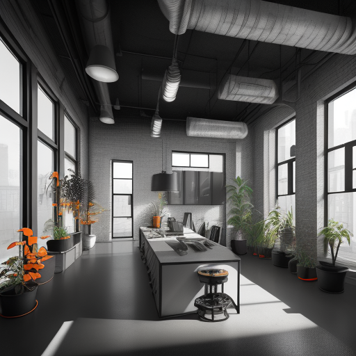 industrial interior style – architect design office,in concrete, brick and black steel. large windows, black mat ceiling, A touch of Bohemian. some plants, Color palette of orange, white,grey and black. Photographed with natural light and high contrast. ultra detailed, Photorealistic, 16K, (office size 9m by 9m) Industrial interior design, Monochromatic palettes of greys, iron black, and white room, raw and rough materials with modern elements. This design blend of both old and new, recycled and repurposed materials, while maintaining a sleek and modern look, --ar 16:9 --v 5.2