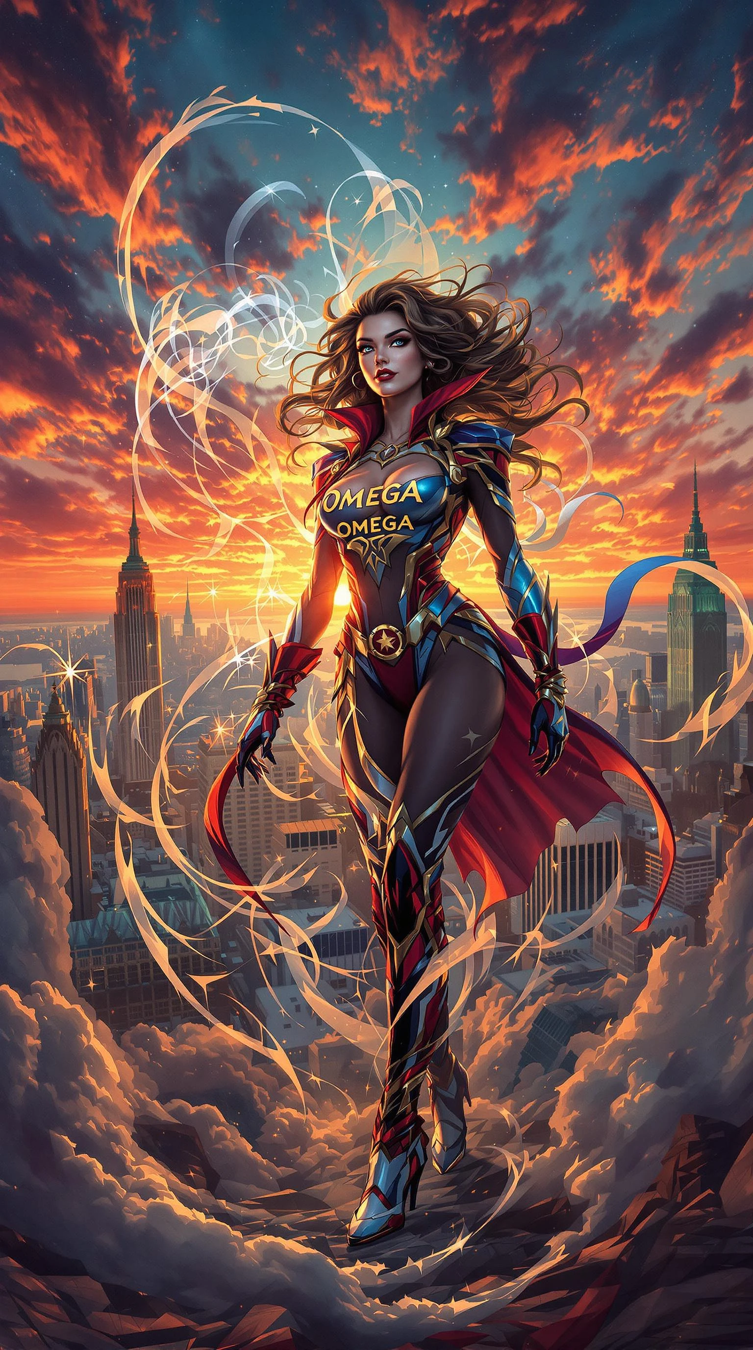 A stunning female superhero, "OMEGA" embossed on her detailed outfit, stands heroically in a vibrant cityscape. Surrounded by swirling coffee steam and dynamic energy bursts, rich colors pop against a dramatic sunset backdrop, showcasing intricate textures and a whimsical, fantastical style.