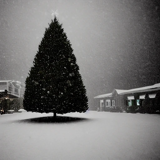Huge Christmas Tree in a town with lot of snow in the style of Gregory Crewdson, cinematic, spooky, night, foggy,