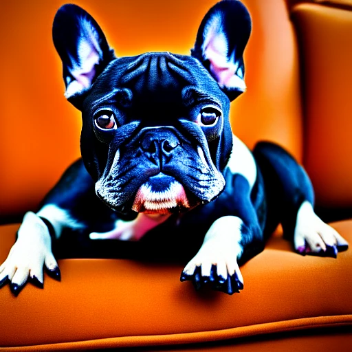 highly realistic high resolution photo of a French bulldog of white and black colors on a sofa