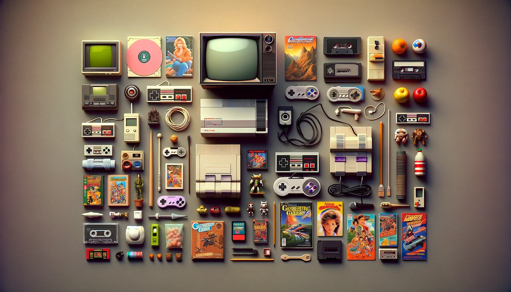 A knolling arrangement of various objects typical for a late 80s gamer kid, neatly organized in a grid layout. Include items such as a classic game console, cartridge-based video games, a joystick, a small CRT television, popular 80s action figures, comic books, cassette tapes, and retro snacks. The scene should evoke a nostalgic feel, with a Wes Anderson-inspired color palette, featuring muted pastels and earth tones. The lighting is studio-like, with soft, even illumination and low contrast, creating a serene and meticulously arranged look, in high resolution resembling an 8K quality.