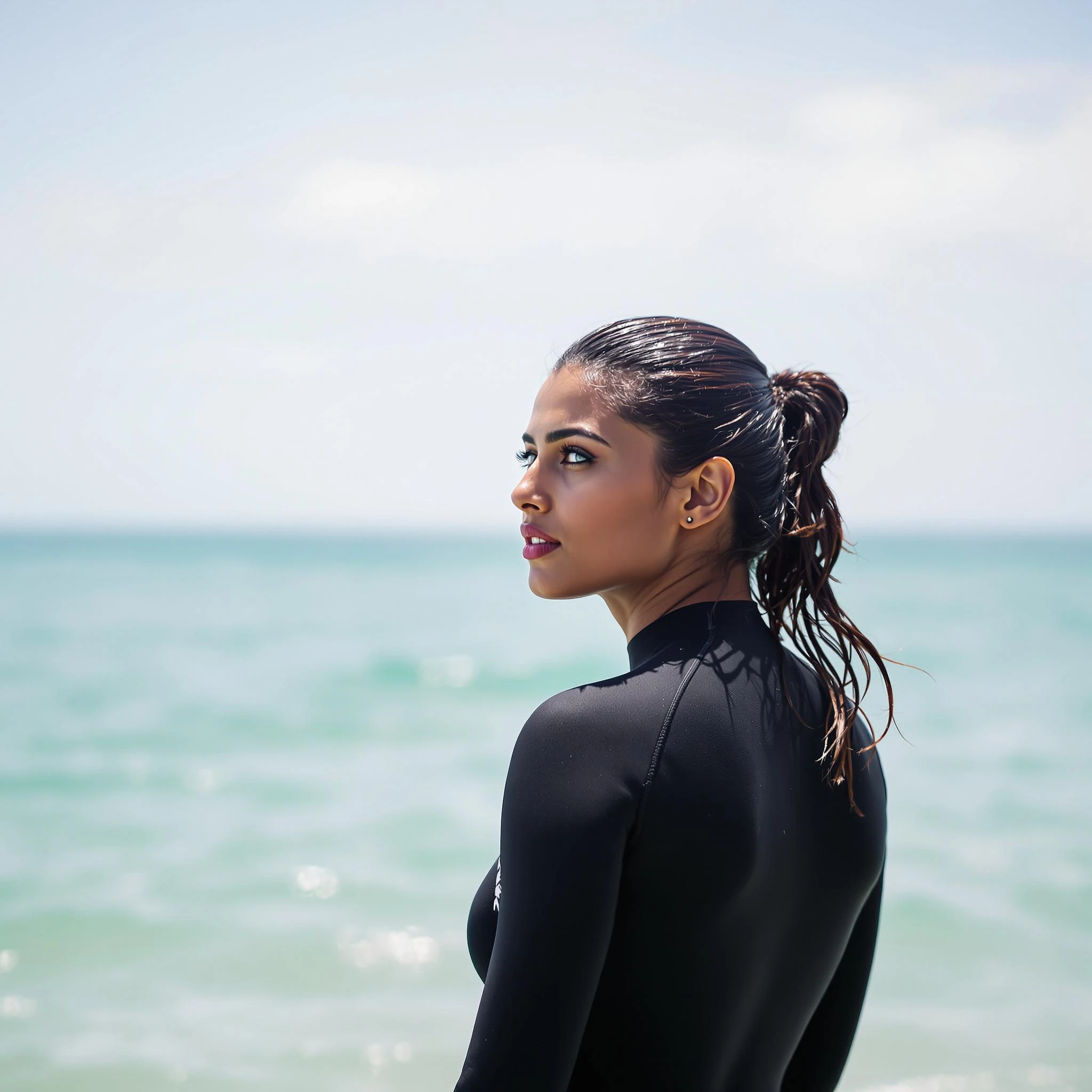 High resolution image. Indian woman in black free diving suit. Focus on her back. Her gaze is to the right. Wet hair in a neatly tied ponytail. The background is a sunny day in the ocean.