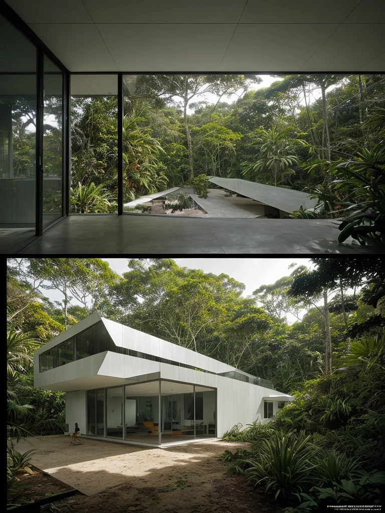 Hyper realistic eye level exterior photo of a futuristic style house overlooking the jungle, daylight, indirect lighting, AD magazine, Frank Lloyd, Eames, Mies van der Rohe