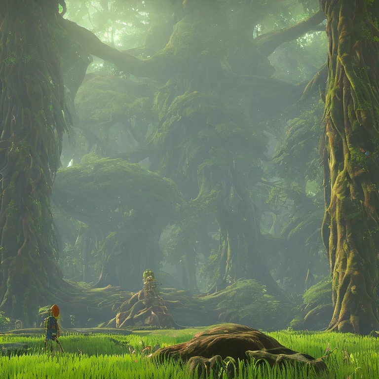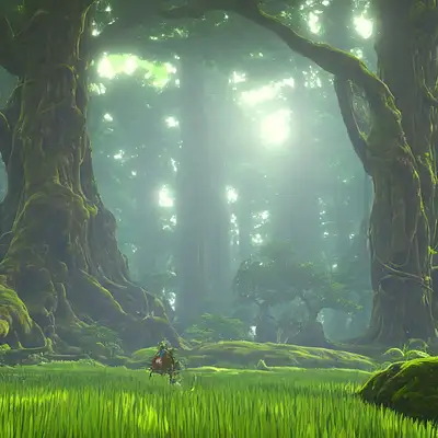 exotic toxic forest, large tall trunks trees, black, hanging vines, moss by Miyazaki, Nausicaa Ghibli, Breath of The Wild --ar 10:20