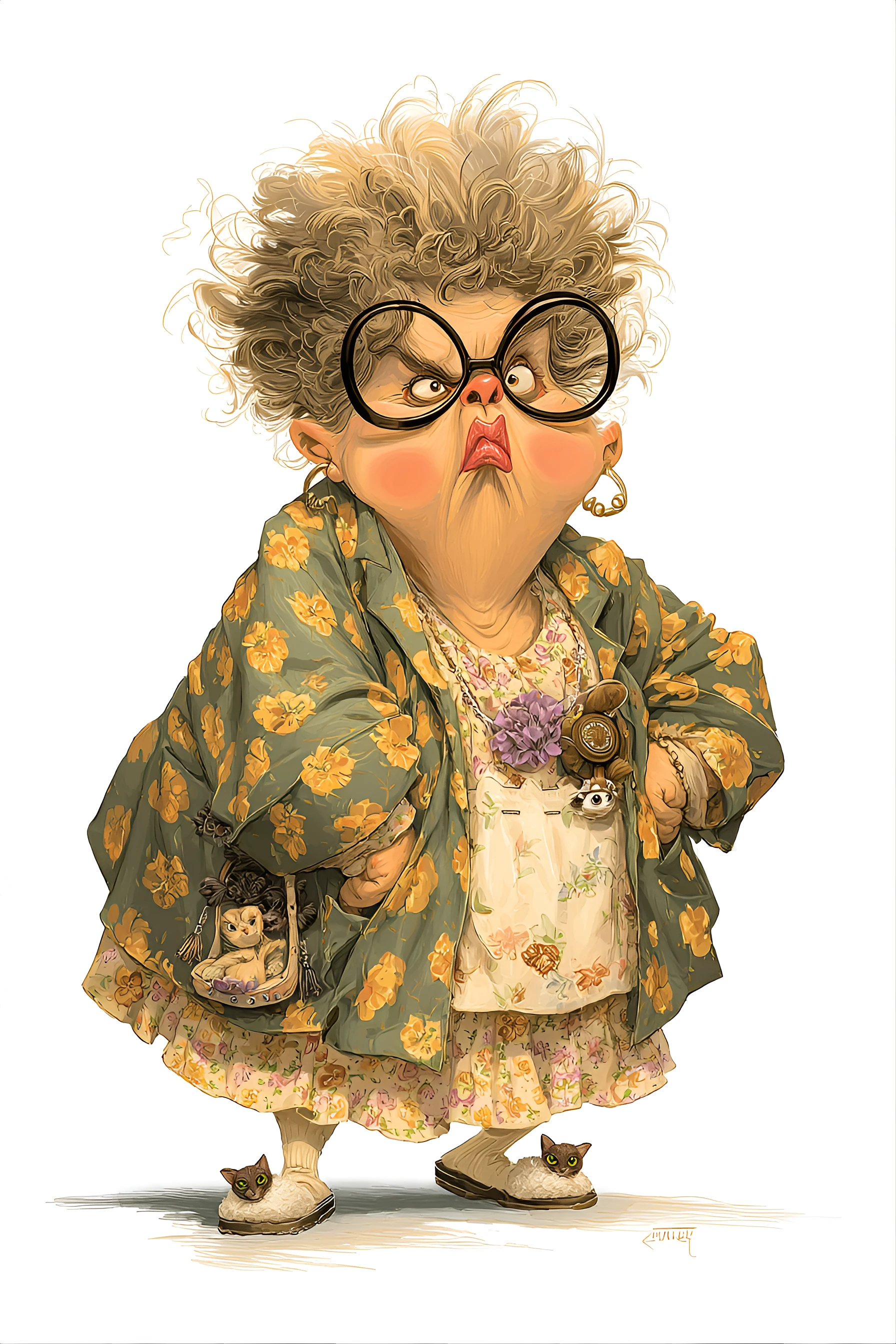 funny caricature, eccentric cat lady, british ethnicity, 62 years old, frazzled, bespectacled, hunched, short stature with wild hair and exaggerated facial features, exaggerated caricature, plump pear-shaped body type, thick glasses, pursed lips, rosy cheeks, frantic expression, the cat lady is wearing a floral housecoat, fluffy slippers, and a cat-print apron, accessorized with cat-shaped brooch, numerous cat toys, and a lint roller, crouching pose, cluttered living room with cat trees, scratching posts, and sleeping cats