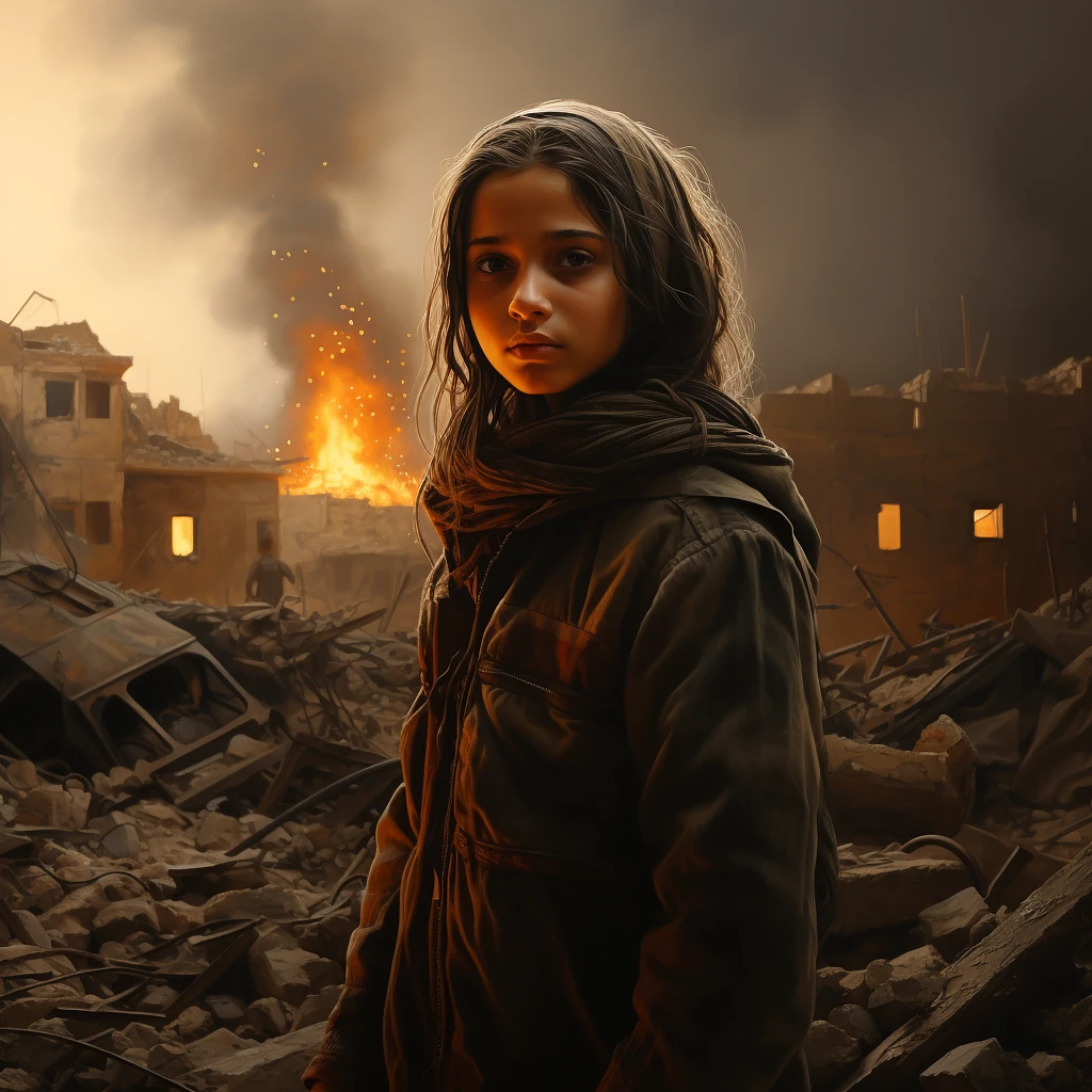 A realistic image of a palestinian young girl, 13 years old, in a war gaza city, her facial expression is one of confusion and despair, style by Steve Hanksa, the background shows the destruction, buildings collapsed, rubble, fire and smoke, provide intricate details in the image. Dramatic lighting, dramatic image, Greg Rutkowski