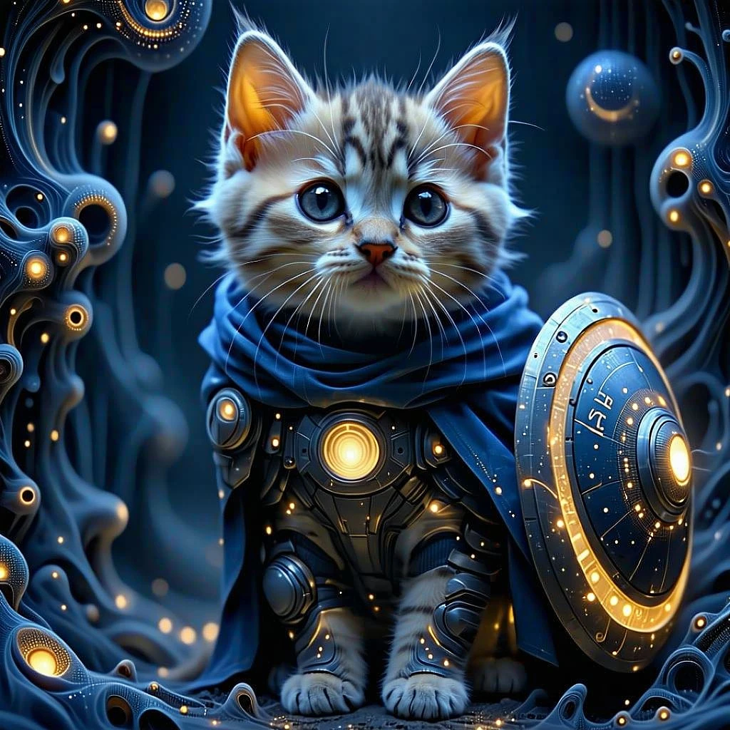 Create a funny, fractal-based artwork featuring a photorealistic ScottishFold kitten as the guardian of its vibe. The kitten should be centered, with intricate, glowing fractal designs swirling around it, symbolizing its unshakable energy. Use a dark, mysterious background with subtle neon highlights. Incorporate humorous details like the kitten holding a shield with the words "Vibe Protector" or surrounded by mismatched people fading into the fractal void.