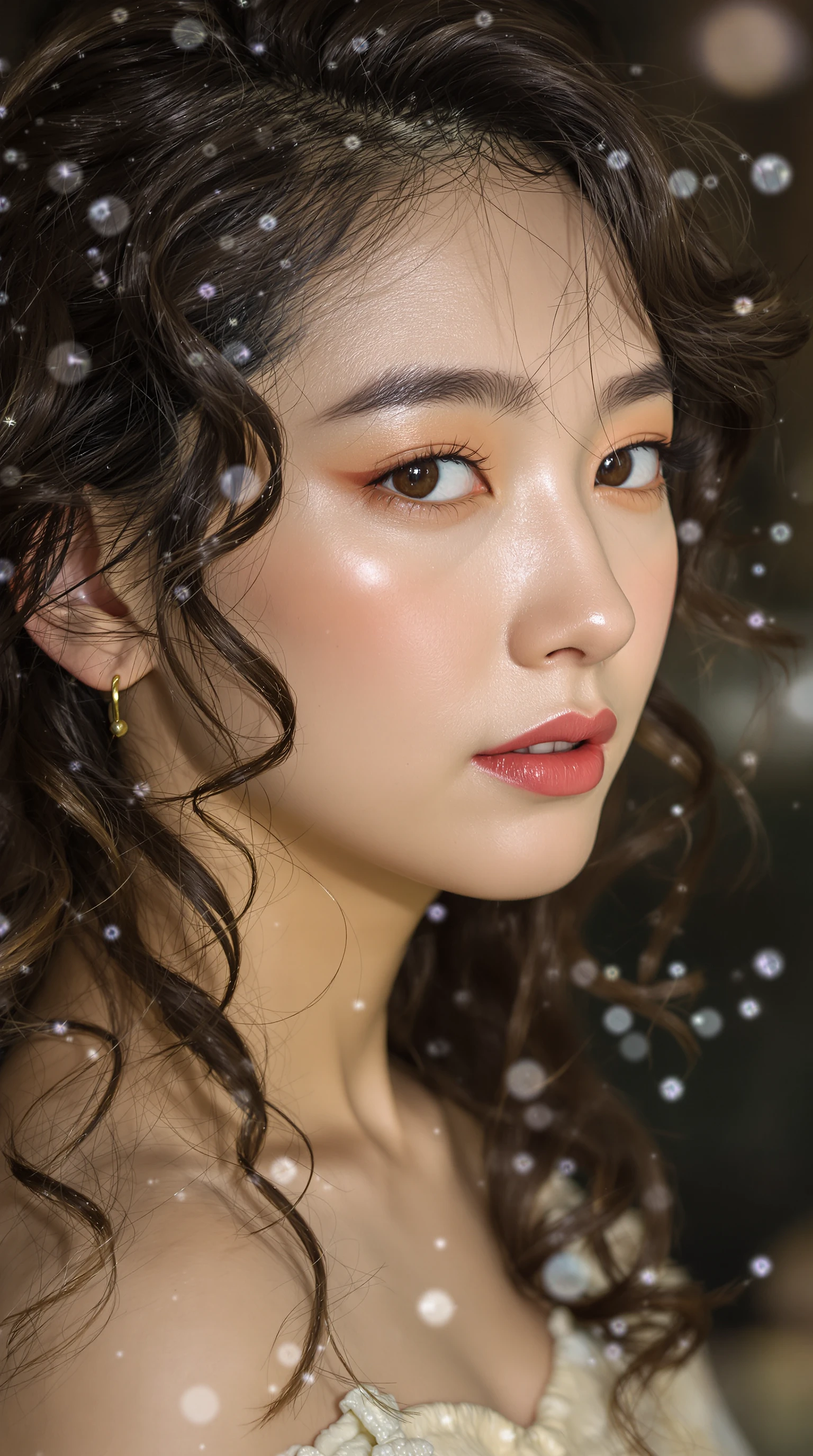 asian attractive woman with her hair curled, in the style of samyang af 14mm f/2. 8 rf, oshare kei, dark beige, hyper-realistic water, distinct facial features, mori kei, hallyu --ar 73:110 --stylize 750 --v 6