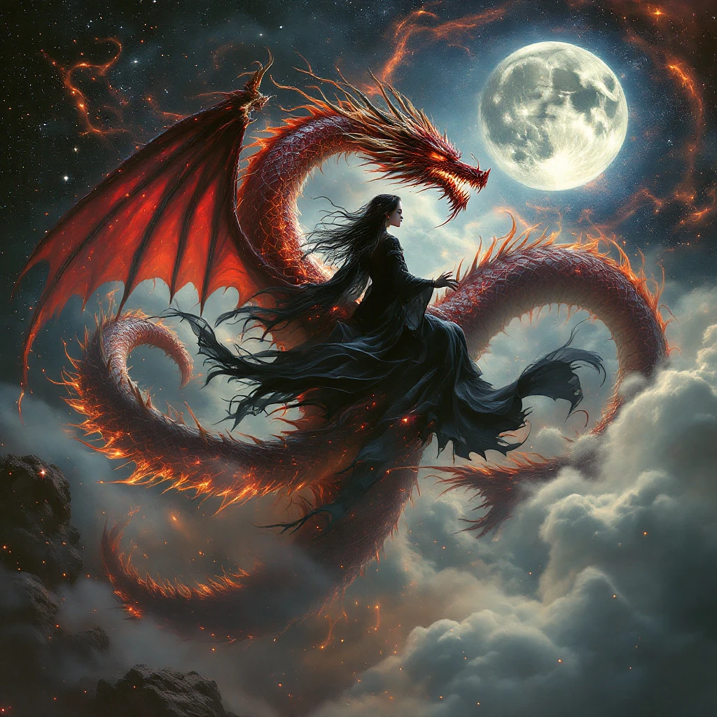 An evil sorceress woman with flowing black garments riding a majestic, red dragon with long whiskers and swirling clouds around them, superimposed over a backdrop of a luminous, swirling galaxy and moon with fire-breathing dragon and shimmering ruby scales flying towards the viewer