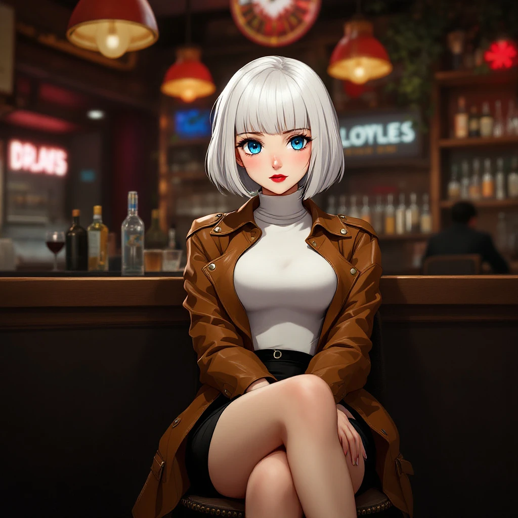 anime, woman, white hair, bob cut, blue eyes, freckles, red lips, white turtle neck sweater, tight turtle neck sweater, short leather jacket, brown leather jacket, black tight skirt, short skirt, bare legs, black high heels, bored expression, sitting on a chair in a bar, sitting with legs crossed, big chest