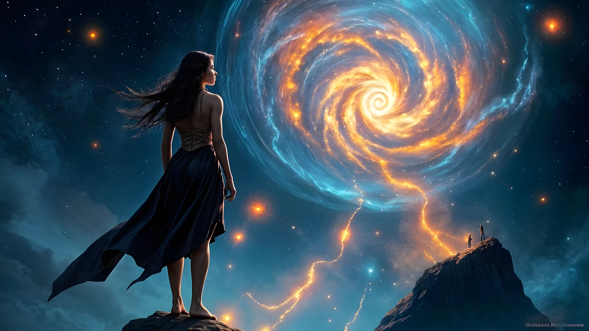 Digital artwork. Seen from behind, A mysterious female warlock nude stands on a cliff edge, gazing up at a sky filled with swirling galaxies and nebulae. Dramatic lighting highlights her silhouette and the cosmic patterns above. The style is painterly, with vibrant, contrasting colors and a sense of awe, reminiscent of fantasy concept art by artists like Brom and Yoshitaka Amano. Keywords: cosmic, ethereal, fantasy art, deep space, magical.
