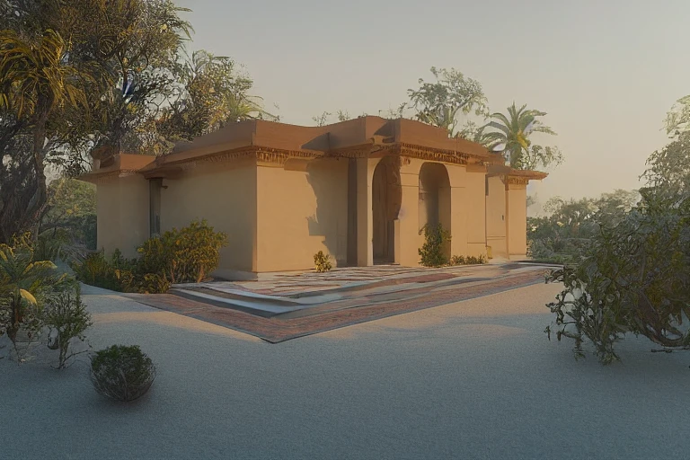 Indian architecture style villa, sunrise, desert environment, small villa, Desert, ash color Concrete, Cubic, geometric, detailed, ultra-realistic, unreal engine, post-processing, 8k octane, de-noise, in frame, centered, wide angle camera, cinematic look, vray, highly detailed buildings, 8k resolution 3d scanned materials, unreal engine, Octane render, hyper realistic, trending on artstation and cgsociety, very bright picture, realistic style