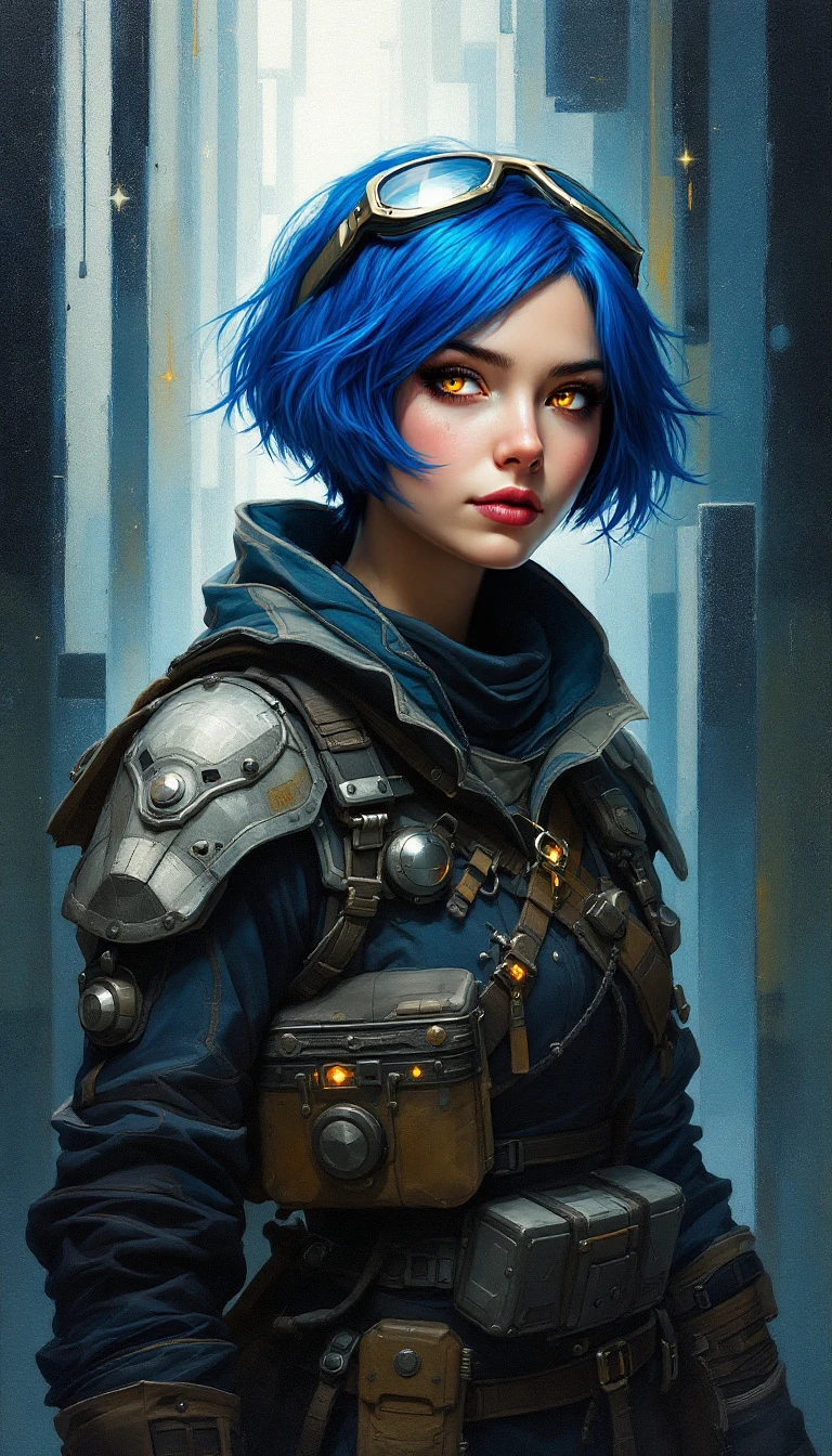 "Lapis Explorer in an Ethereal Labyrinth": A mesmerizing abstract painting presents an explorer, exuding both courage and a sense of wonder. She is a skilled traveler, depicted amidst a complex labyrinth of light and shadow, with fair features, short, vibrant lapis-blue hair styled in a practical, yet stylish bob, and a layered outfit with practical details. Navigation tools and protective armor are integrated with her attire and gloves. The artwork skillfully blends modern abstraction with a character study, creating a mysterious and compelling scene with colors such as blues, silvers, and whites. Her keen, amber eyes, the focal point of the composition, convey both an adventurous spirit and a sense of inner knowledge. After a long journey through an unknown space, the explorer embodies both resilience and a thirst for discovery. The dynamic forms and subtle lighting invite the observer to uncover the hidden narratives within this vibrant piece, presented as a painting.