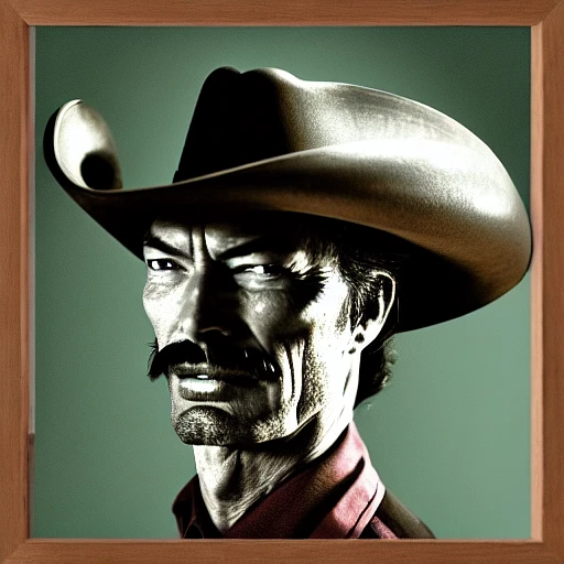 retrato de vaquero, cara de lee van cleef joven de 40 años, piel verde oliva, pelo largo y rubio, sombrero stetson negro plano, sombrero de ala plana, fondo liso, intrincado, elegante, muy detallado, pintura digital, arte conceptual, suave, enfoque nítido, ilustración, sin barba