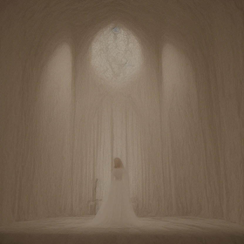 In the heart of a grand, gothic medieval master bedroom, a woman stands majestically by a cascading waterfall, her presence illuminated by the soft, ethereal glow of candlelight. Her golden locks cascade down her back like a river of sunset hues, framing her porcelain skin and accentuating her striking features. Her attire is a vision of elegance, a flowing white gown with intricate lace details and a delicate silver belt that cinches at her waist, creating a silhouette that is both statuesque and feminine. The room itself is a masterpiece of medieval architecture, with towering stone walls adorned with cobweb-covered tapestries and a vaulted ceiling that seems to stretch up to the heavens. The air is thick with the scent of old books and dust, and the sound of the waterfall creates a soothing melody that seems to wash away all worries and cares. The lighting is dim, with only a few candles flickering to cast shadows on the walls, creating an atmosphere that is both intimate and mysterious. The camera perspective is one of reverence, capturing the woman from a low angle as if to emphasize her statuesque beauty. The style is one of classic elegance, with a focus on capturing the intricate details of the room and the woman's attire. The camera used is likely a high-end digital SLR, with a wide-angle lens to capture the grandeur of the room and a shallow depth of field to blur the background and emphasize the subject. The overall effect is one of timeless beauty, a moment frozen in time that seems to transcend the ages.