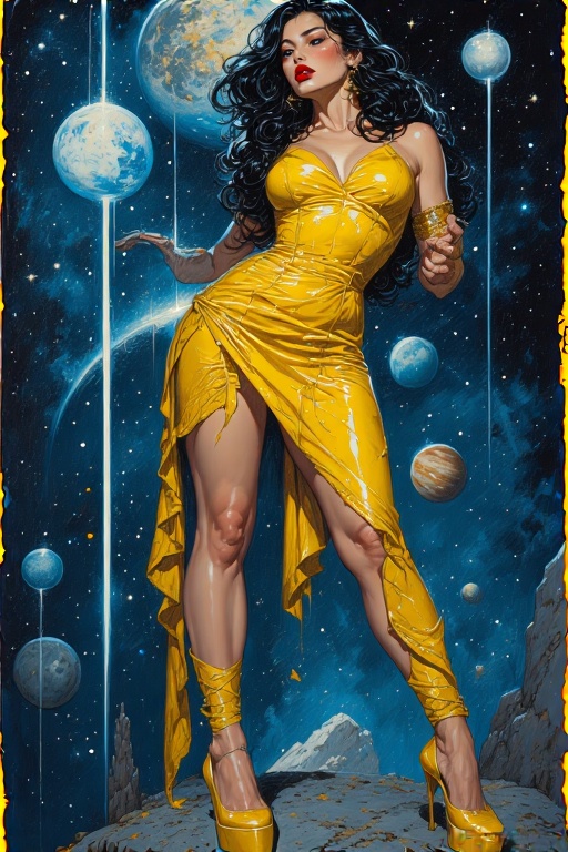 ChatGPT Image prompt: a painting of a woman in a yellow dress, heavy met...