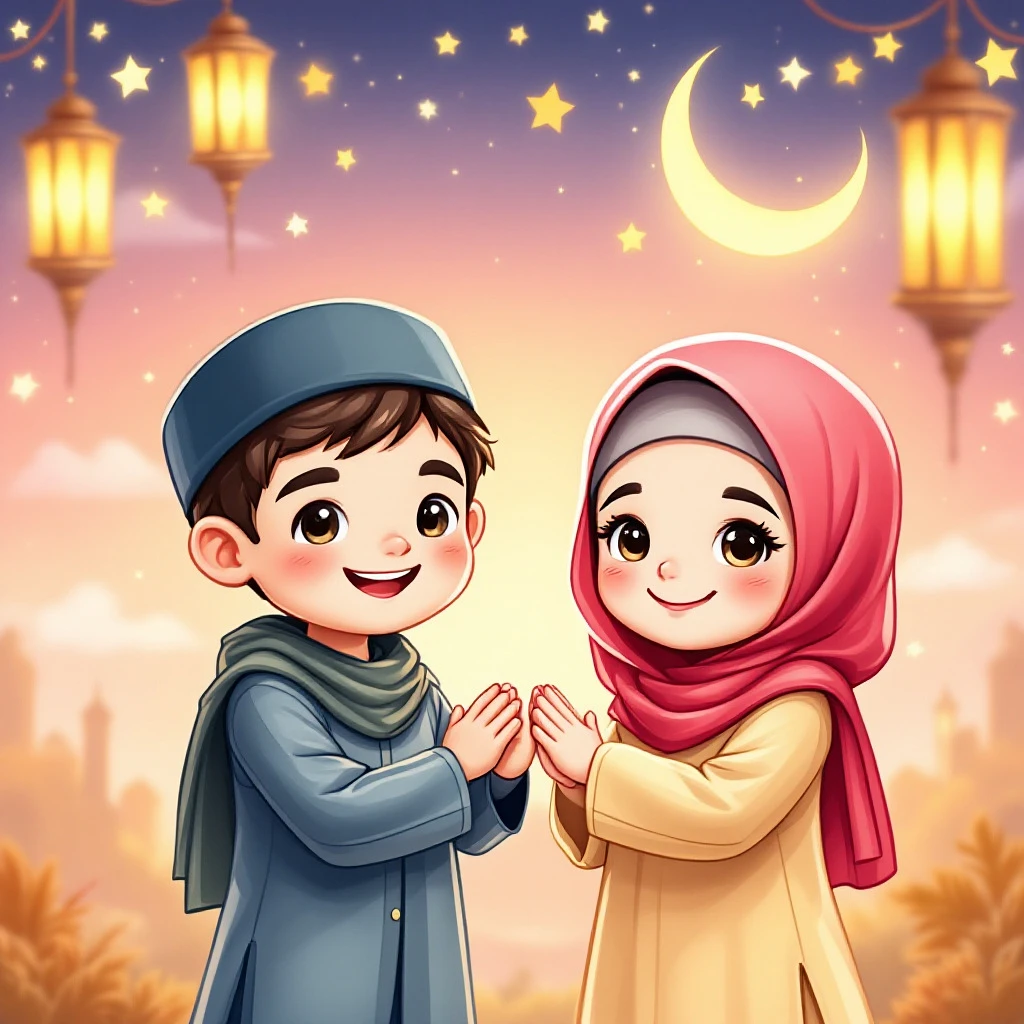 kazakh A cute Muslim boy and girl celebrating Eid Mubarak. Both are dressed in traditional Islamic clothing, smiling and holding their hands together in a greeting gesture. The background is bright and festive, featuring lanterns, stars, and a crescent moon. The style is cartoonish, with soft lines and pleasant colors.