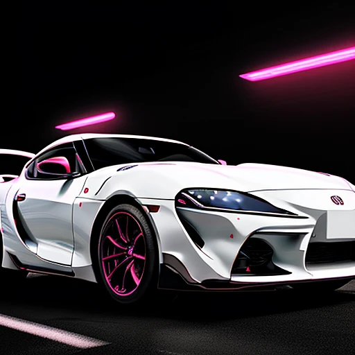 A sleek white Toyota Supra MK4 with neon light accents, pink and red headlights, and ultra-realistic shedders, illuminated by a night vision glow, looking very aggressive,